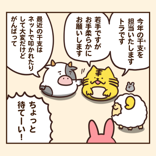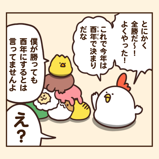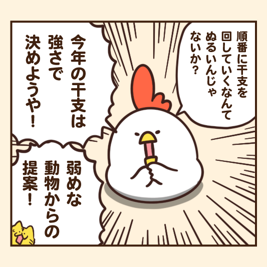 2022/01/02 もしも十二支が強さで干支を決めたら あけましておめでとうございます!昨年は年末にちょっと投稿をミスったりありましたが、2022年も変わらず土曜日以外毎日投稿目指してがんばっていきます 「もしもの世界」カテゴリの最新記事 < 前の記事次の記事 > コメント コメント一覧 (7) 1. (え) 2022/01/02 12:07 そうか…来年はヒヨコ年か(笑) 今年もヨロしくお願いします(^人^) 0 everyday_debudo ri がしました 2. じゅん 2022/01/02 12:17 明けまして、おめでとうございます。 ヒヨコ年で、今年も頑張りましょう(笑) 0 everyday_debudo ri がしました 3. ふーこ 2022/01/02 13:57 あけましておめでとうございますm(*_ _)m 酉年があるだけいいじゃない!! 0 everyday_debudo ri がしました 4. うな 2022/01/02 15:29 ひよこ年の次はペンギン年だ。 ピノさん頑張れ!(๑•̀ㅂ•́)و✧ 今年もでぶどり達の活躍を、楽しみにしています♡ 0 everyday_debudo ri がしました 5. 2022/01/05 14:50 ニワトリもヒヨコも酉で良いんじゃない?(笑) 0 everyday_debudo ri がしました 6. べい 2022/01/05 19:21 ひよに負けてぐにゃ~ってなってるうさぎがかわいい 0 everyday_debudo ri がしました 7. こんにちは 2022/01/21 18:40 おもろっ!(笑) 0 everyday_debudo ri がしました コメントフォーム 名前 コメント 記事の評価 リセット リセット 顔 星 情報を記憶 コメントを投稿する